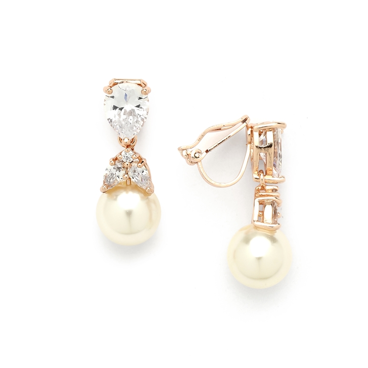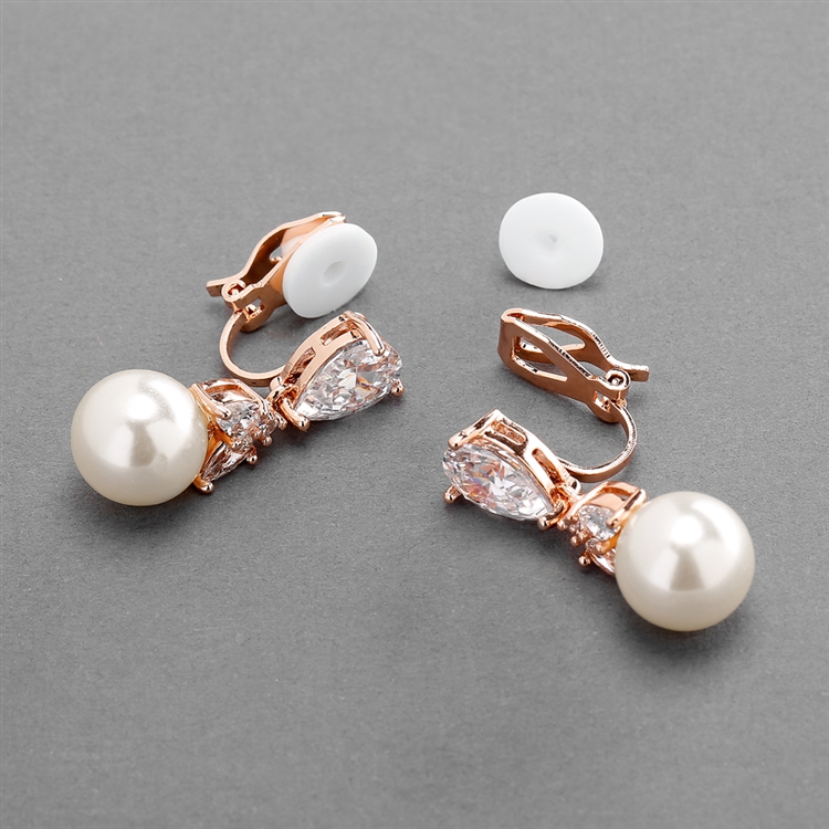Rose Gold CZ Cip-On Bridal Earrings with Pearl Drops