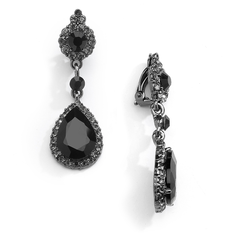Jet Black Crystal Clip-On Earrings with Teardrop Dangles in Hematite Plating