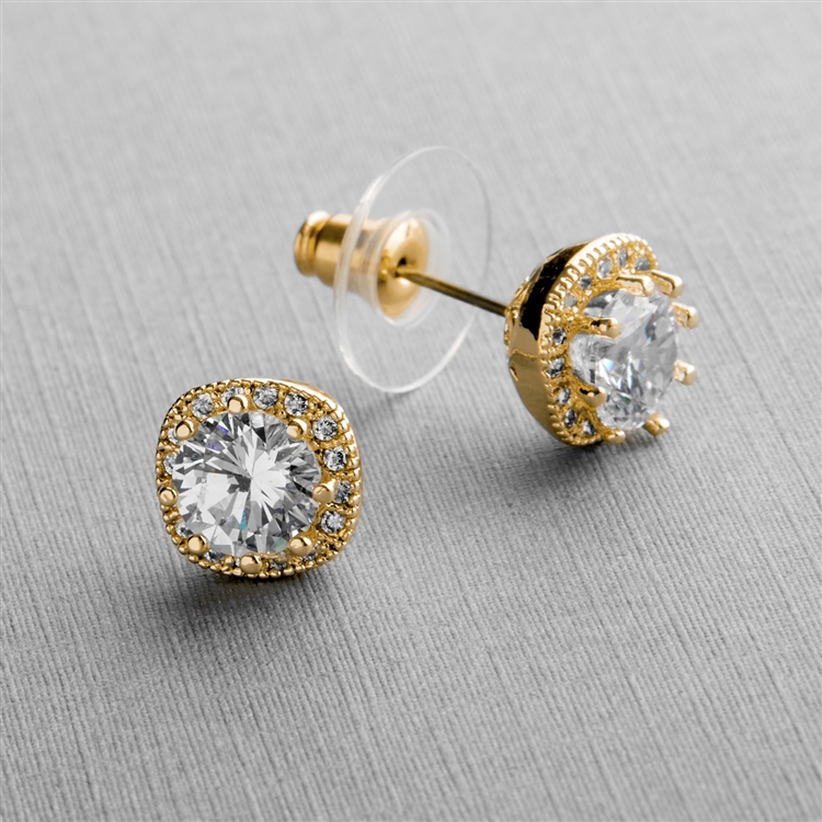 Gold Cushion Shape CZ 10mm Halo Stud Earrings with Round Cut Solitaire