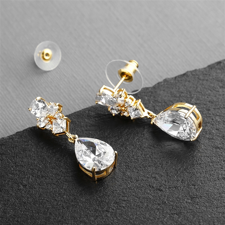 Gold Cubic Zirconia Teardrop Pear-Shaped Dangle Drop Wedding Earrings