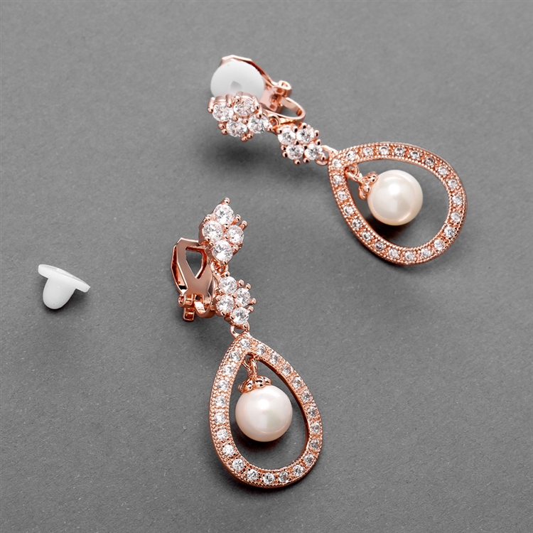 Rose Gold CZ Wedding Clip Earrings with Caged Pearl