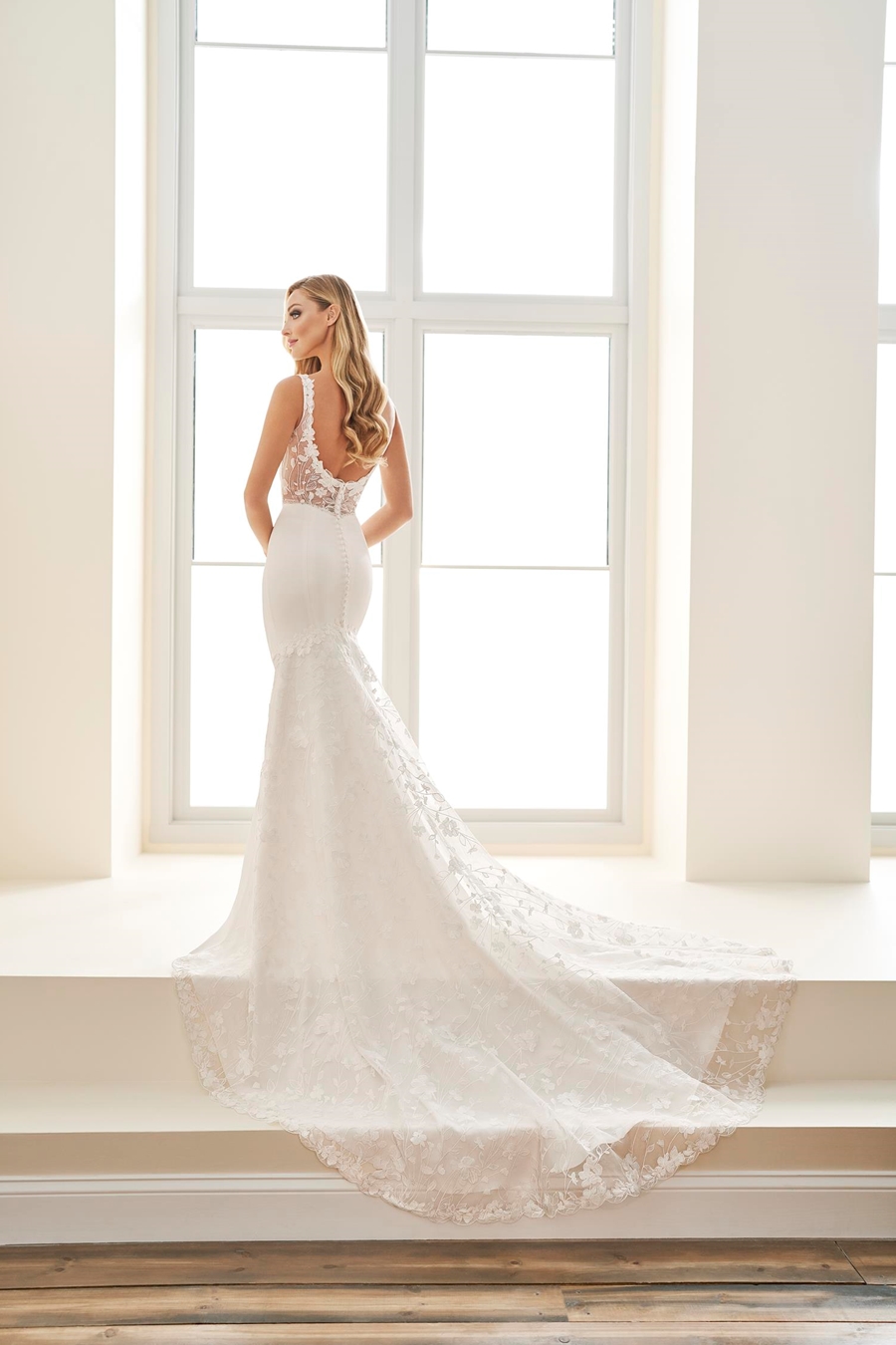 Classic lines and charming features like covered buttons and sparkly sequin lace applique make this charming slip wedding dress perfect for every venue, from a dressy destination wedding to a formal evening affair. Bridal gown is available to special order in Ivory/Ivory, sizes 2-30.
