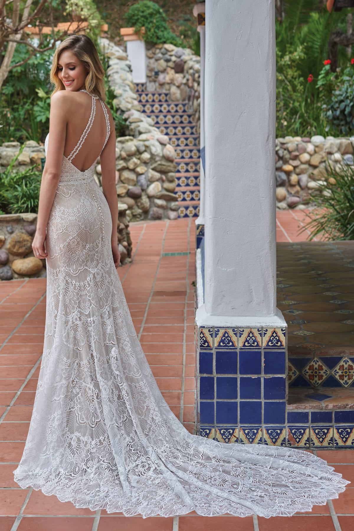 Chantilly lace fit and flare bridal gown with a flattering halter neckline with refined trim neckline and scallop lace pattern. A gorgeous Semi-Cathedral train with a beaded top as an accessory option. Available for special order in Ivory/Mica, Ivory/Ivory, Ivory/Gold, White/White in sizes 00-34.