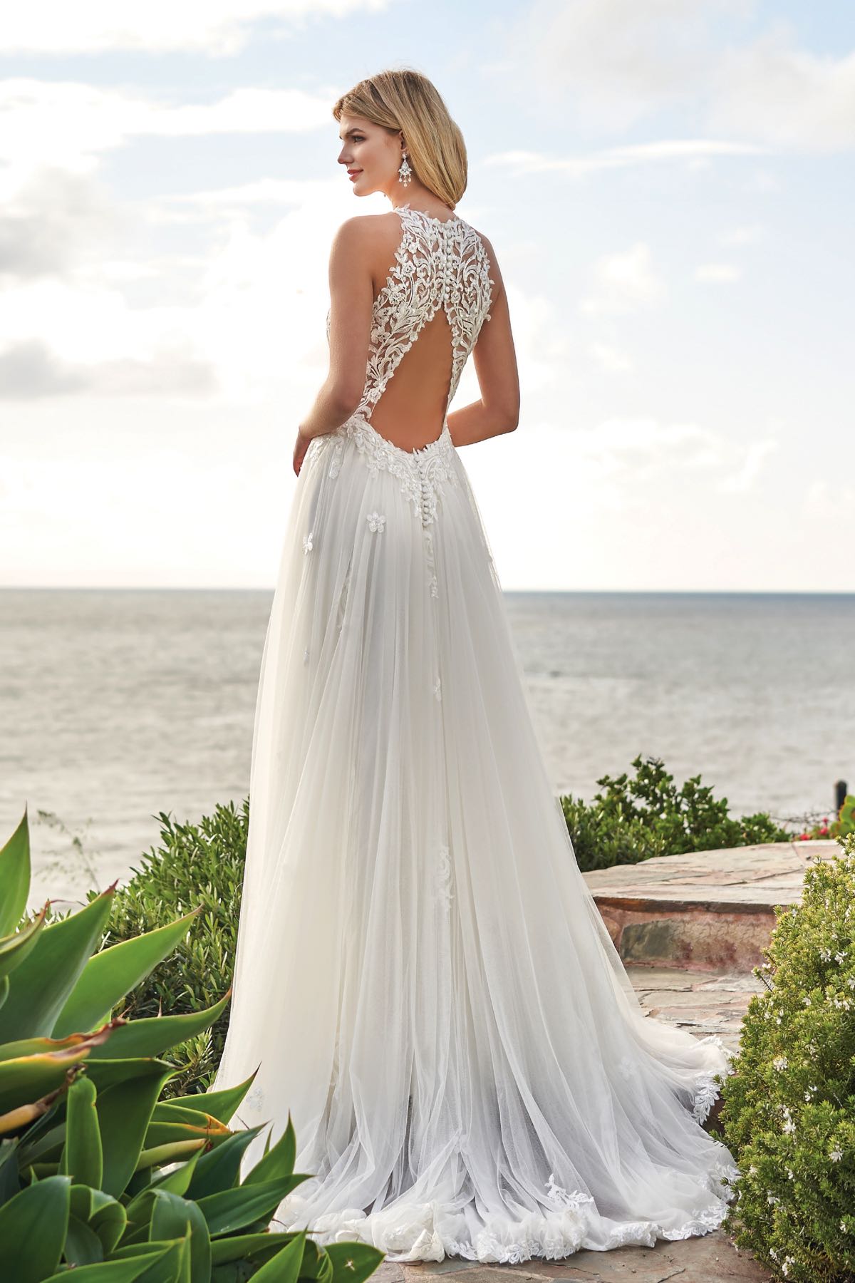 Ivory/Vintage embroidered lace and netting wedding dress with a beautiful halter neckline and keyhole cut out in the back. A romantic whimsical bridal gown with an A-line silhouette and sweep/tiffany train. Available to special order in Ivory/Vintage in sizes 0-34.