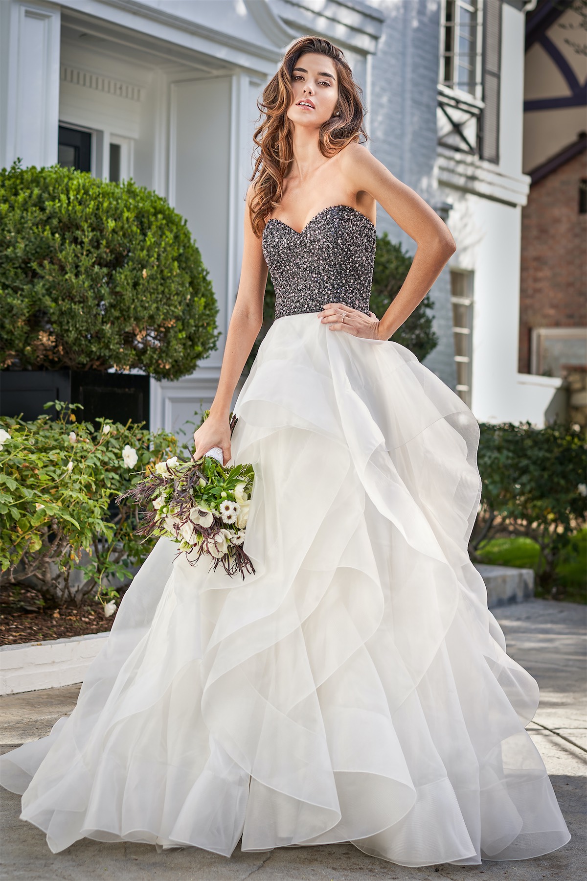 A sparkly romantic bridal ballgown with a hand beaded encrusted sweetheart top and a ruffled organza skirt. The train is Semi Cathedral and the back bodice has buttons. Available for special order in Ivory/Ivory, Ivory/Black in sizes 00-34.