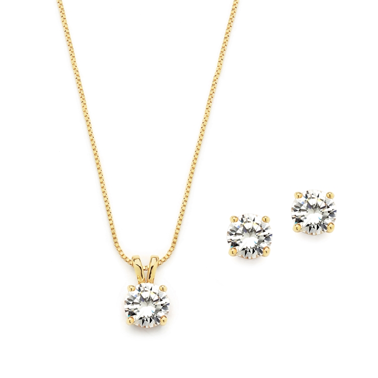Brilliant 8mm 2 ct. cubic zirconia solitaire pendant drops gracefully from an adjustable 16.5″ – 19″ box chain necklace with elegant split bale design. Our matching 2 carat stud earrings feature gleaming round-cut cubic zirconia simulated diamonds in a 14k gold plated 4-prong setting. This versatile casual yellow gold jewelry set is guaranteed to be a new versatile favorite! We love the dress up or dress down versatility of this best-selling necklace and earrings set.