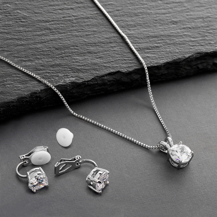 Rhodium Plated CZ Pendant Necklace and Clip-On Earrings Set.