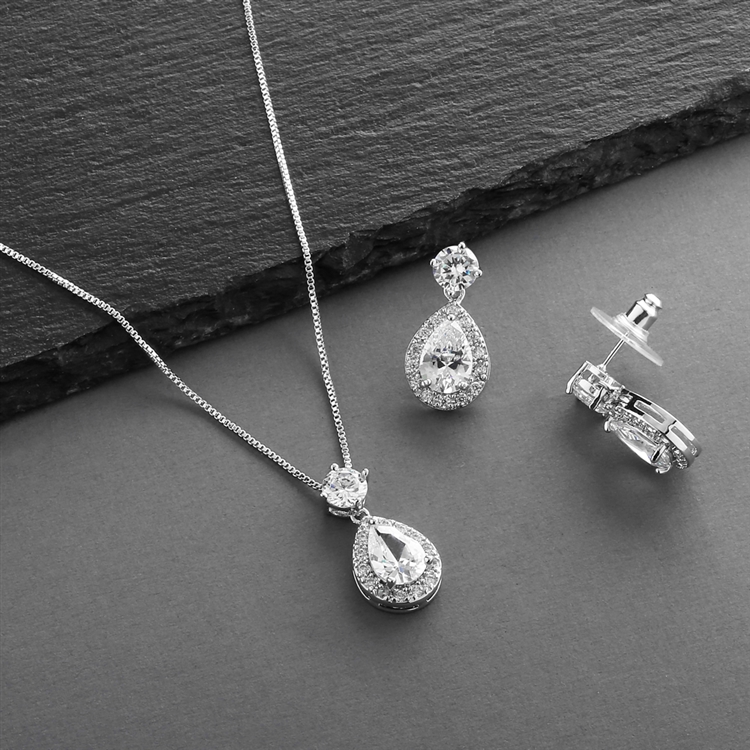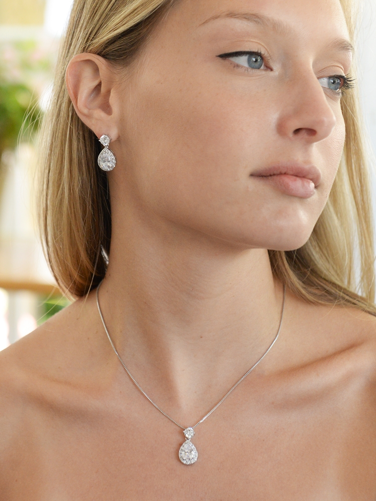 Brilliant CZ Halo Pear Shaped Necklace and Earrings Set.