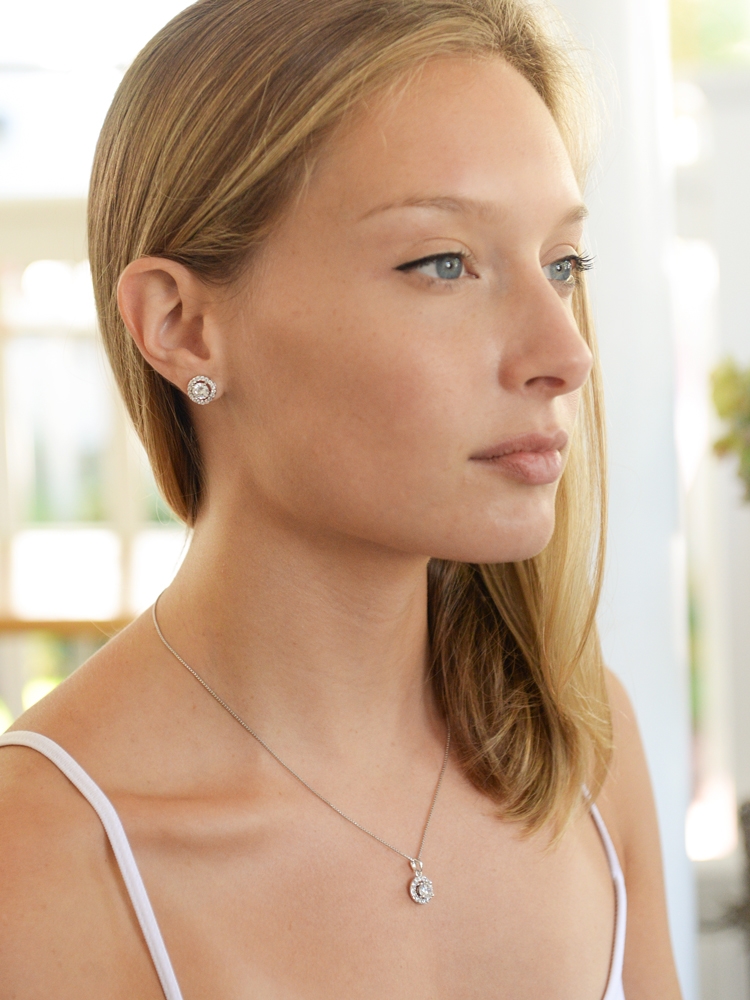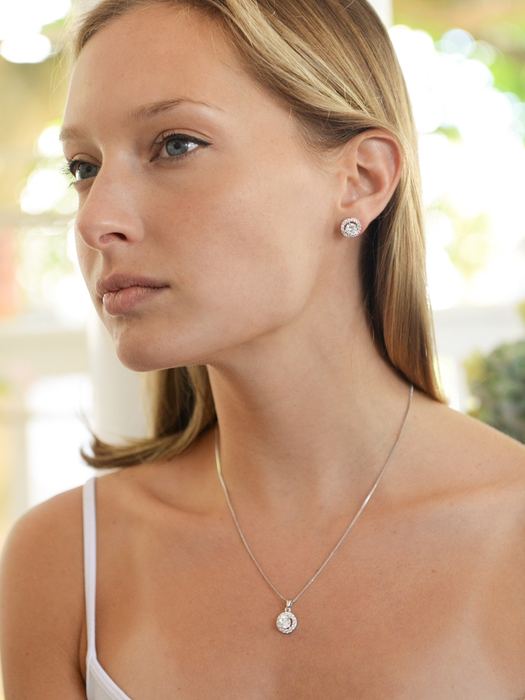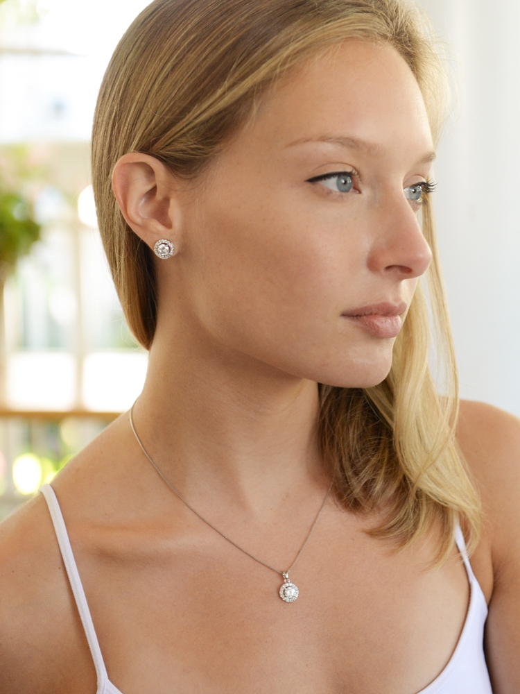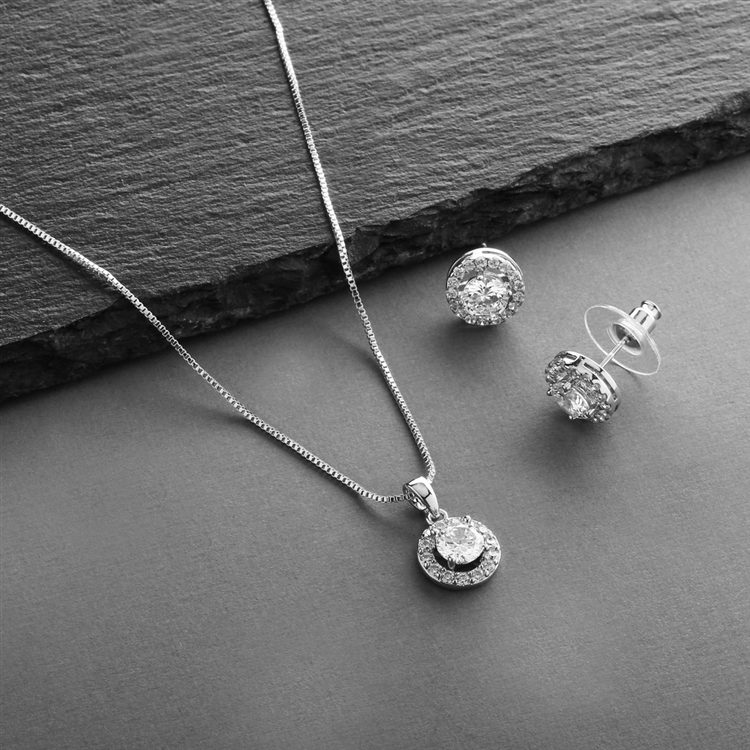 Cubic Zirconia Round Shape Halo Necklace and Stud Earrings Set.