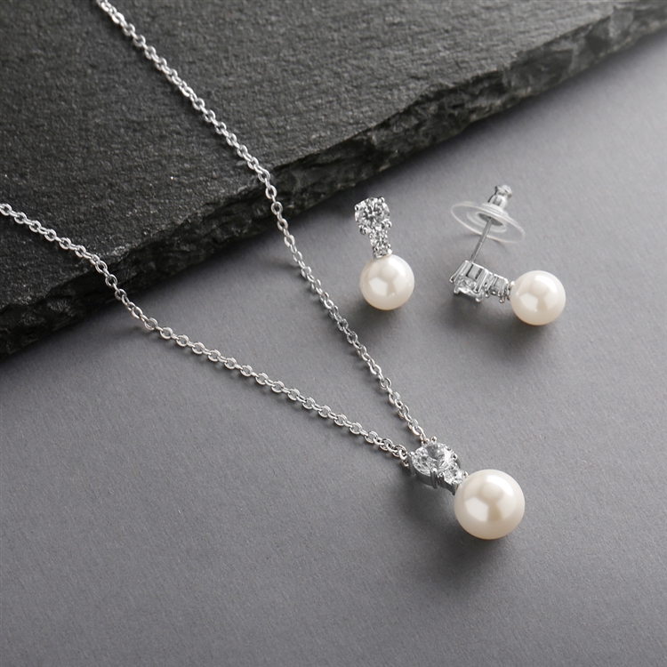 Pearl Drop Necklace Set with Vintage CZ Top and Dainty Earrings.