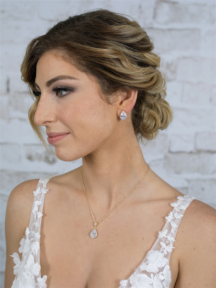 14K Gold CZ Pear-Shape Necklace & Earrings Jewelry Set.