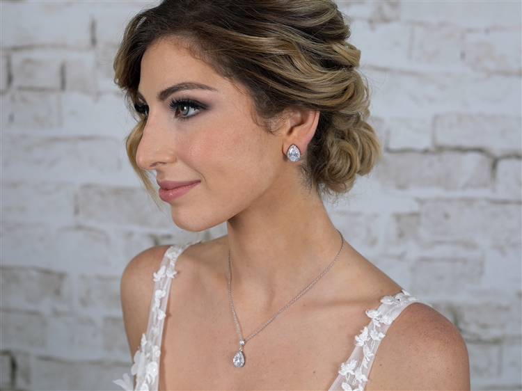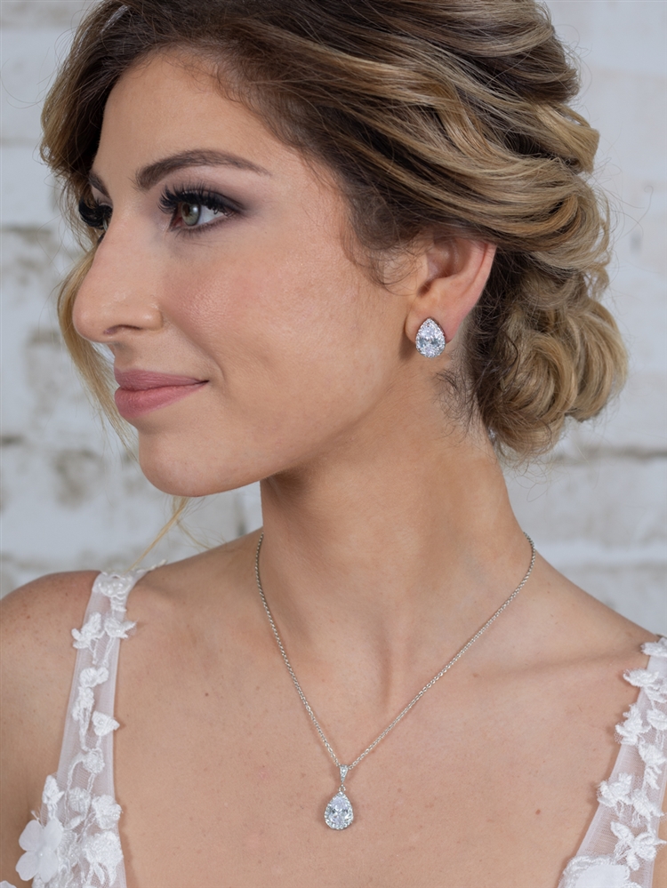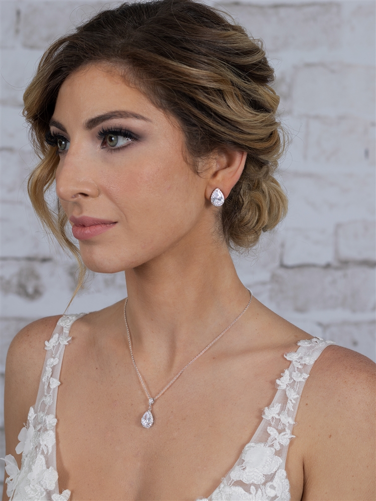 Silver Platinum CZ Pear-Shape Necklace & Earrings Jewelry Set.
