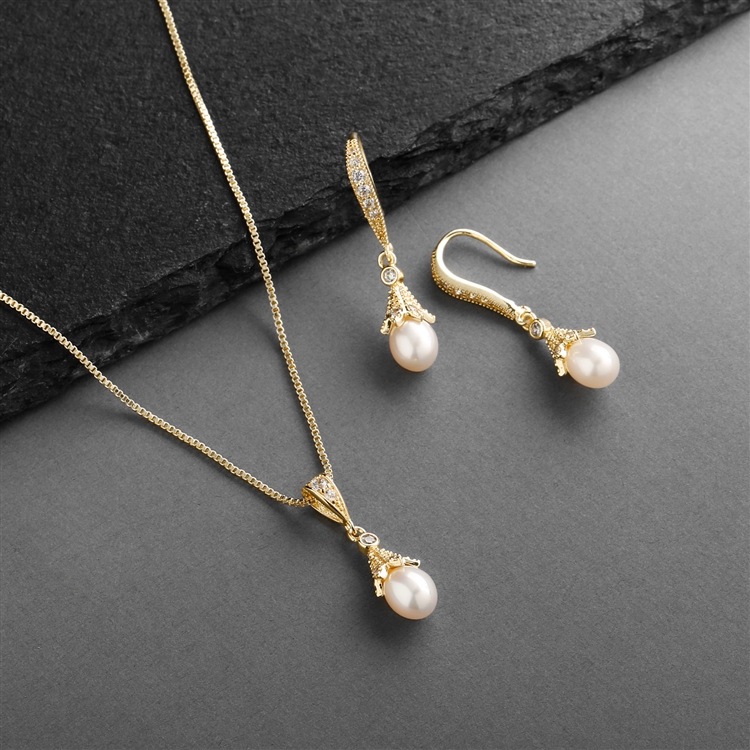 14K Gold Necklace & Earrings Jewelry Set with Freshwater Pearl.