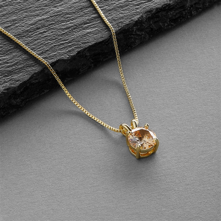 Delicate 14K Gold Round-Cut Champagne CZ Necklace with Double Loop Top.