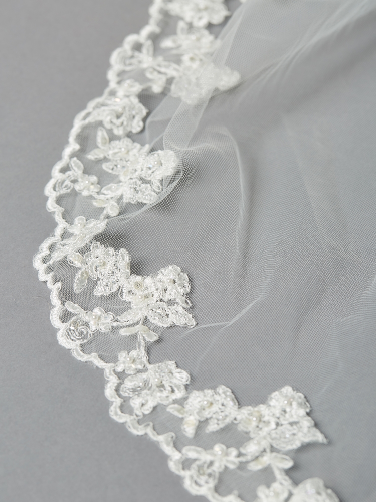 The beautiful Cathedral length Mantilla wedding veil is embellished top to bottom with bold scalloped lace. Boasting pearls and iridescent sequins, this best selling Mantilla veil adds luxurious style to any wedding gown. The dramatic lace border runs completely around the veil for head-turning couture. Measures 108″ L x 71″ w and includes a sewn-in flexible metal comb for day into night comfort.